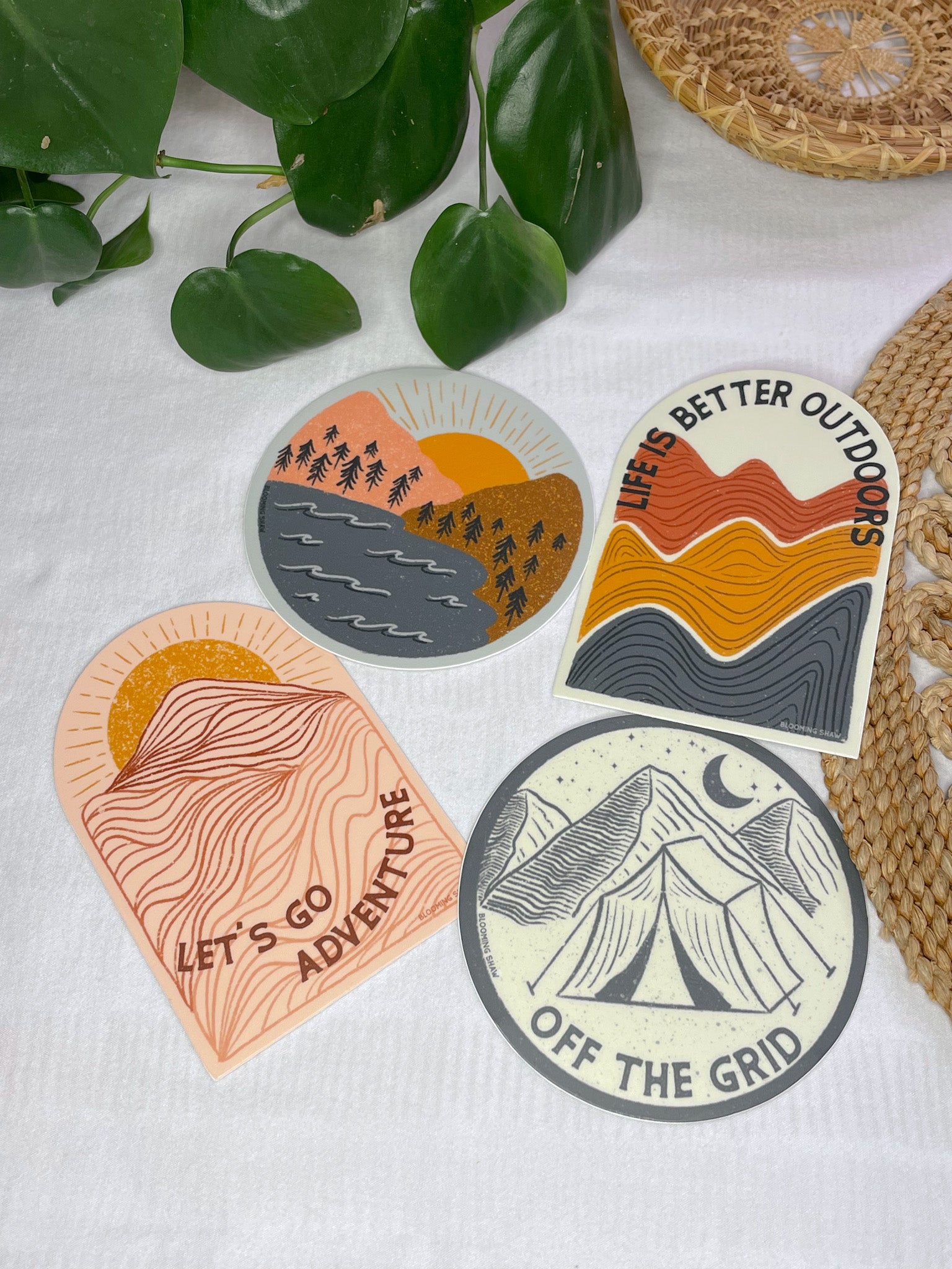This sticker is part of the "Just Go" sticker collection. It is inspired by adventuring in the outdoors and the joys of exploring.